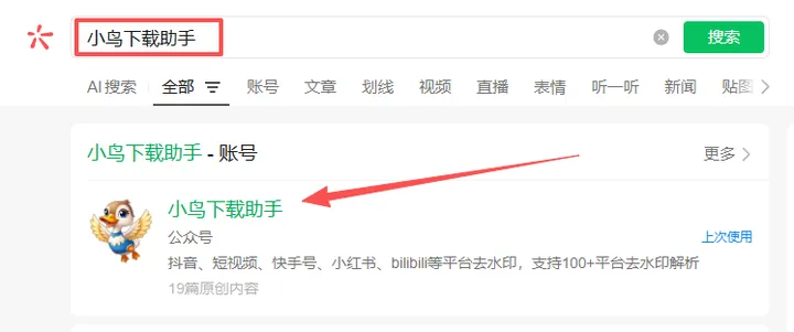 • 微信顶部搜索框输入:「小鸟下载助手」或「磁力去水印」