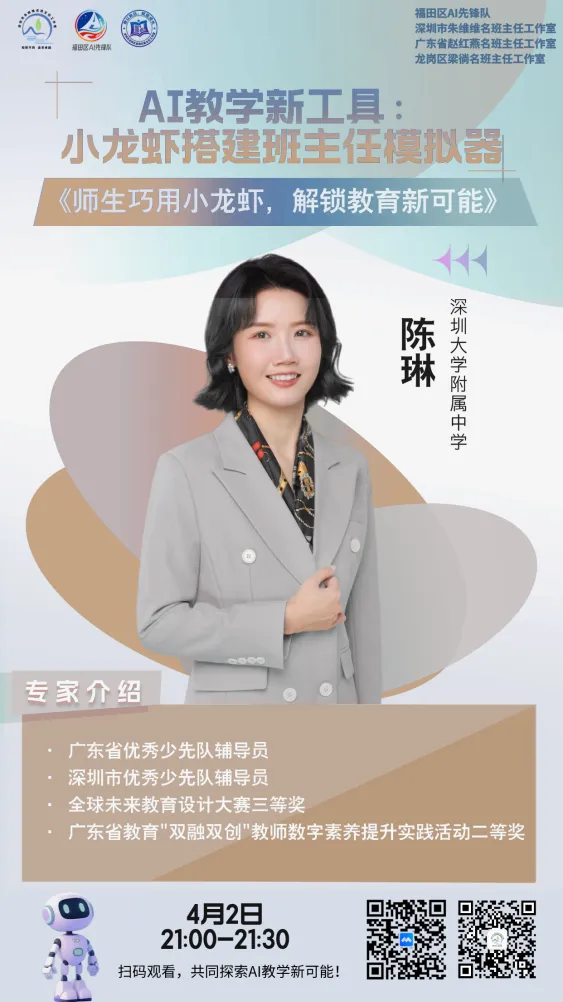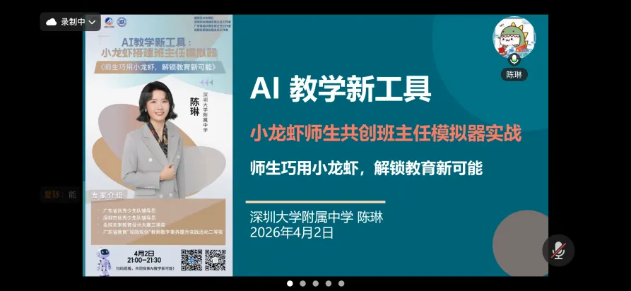 4月2日21:00,在福田区AI先锋队和广东省赵红燕名班主任工作室的指导下,深圳市朱维维名班主任工作室联合龙岗区梁徜名班主任工作室,共同举办了AI赋能教育教学沙龙第二期活动。本次沙龙以“AI赋能教育与班主任模拟器开发”为分享主题,特邀工作室陈琳老师为主讲嘉宾,围绕AI工具实践应用与创新育人展开深度交流,活动由龙岗区梁徜名班主任工作室成员葛琴主持。