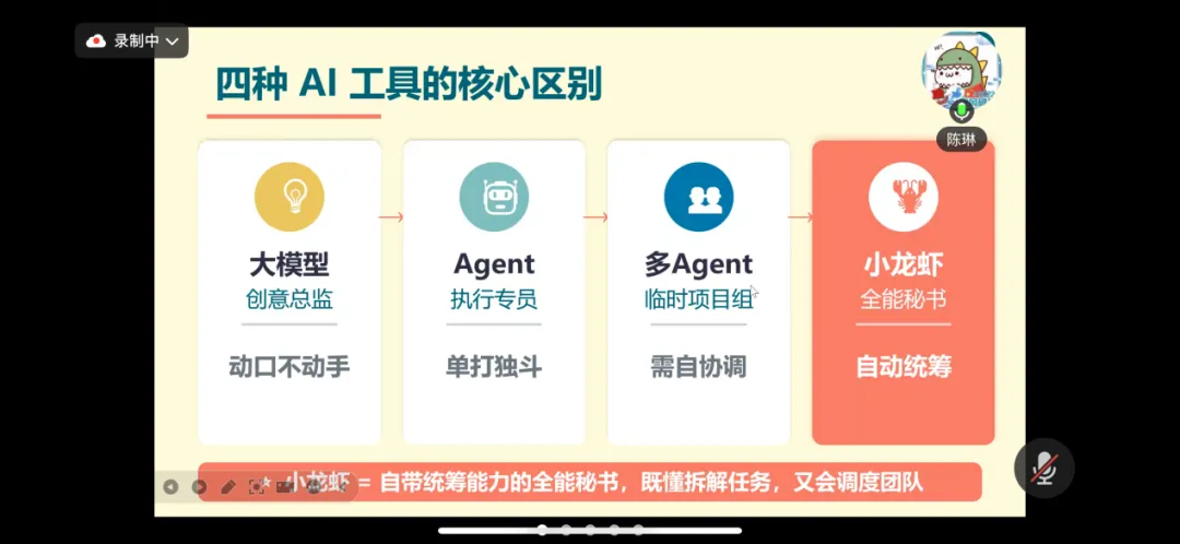 活动伊始,陈琳老师结合自身实操经验,为参会教师梳理了当前主流AI工具的应用差异与选型思路,让大家清晰认识大模型、Agent及小龙虾(Crawfish)的功能特点与适用场景。