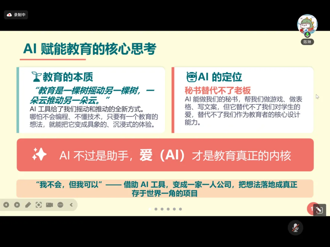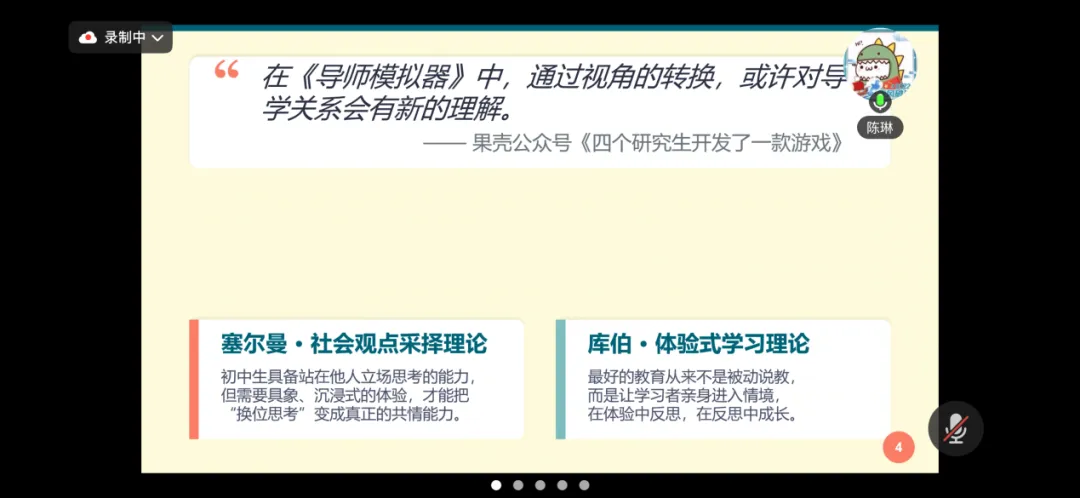 陈琳老师介绍了使用workbuddy开发班主任模拟器的实践,旨在打破传统说教式德育,让学生转换视角体验班主任的日常工作,在沉浸式体验中学会换位思考,培养共情能力。