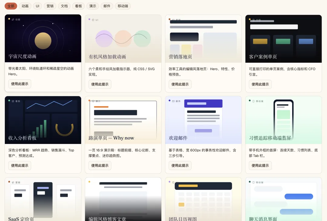 HTML(内联 CSS)、PDF、PPTX、ZIP、Markdown——五种格式直接导出。生成的不是预览图,是可二次开发的代码。