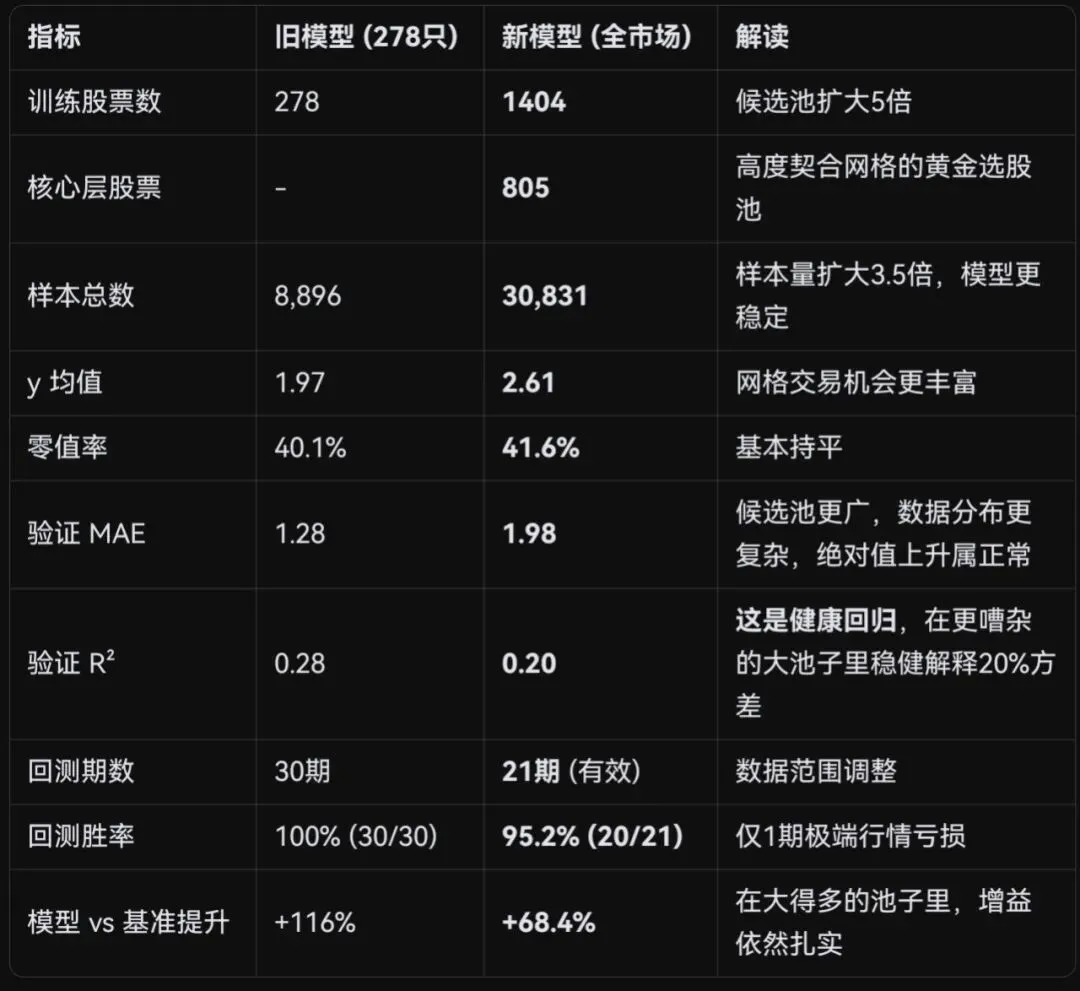 这份最终结果,宣告你的全市场模型已就绪。虽然交叉验证的R²和MAE的数值表面上“变差”了,但这恰恰是模型从“窄池玩具”进化为“广池工具”时的正常且健康的信号。