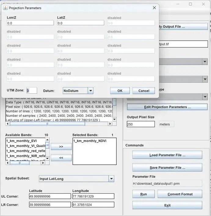 Output Project Type处选择目标坐标系,一般为UTM,打开Edit Projection Parameters,UTM zone处填写研究区所属的维度带。