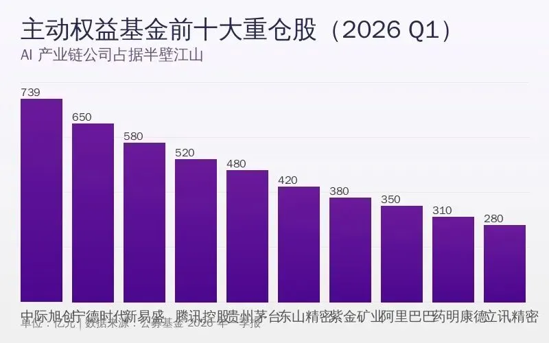 一季报显示,主动权益基金一季度末前十大重仓股中: