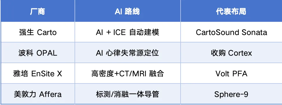 更关键的是它的”位置”——Sonata 与强生自家 PFA 平台 Varipulse(2024 年已获 FDA / CE)深度绑定。Carto 标测 + ICE AI 建模 + PFA 消融,强生正在搭一条从术前规划到术中执行的全链路闭环。
