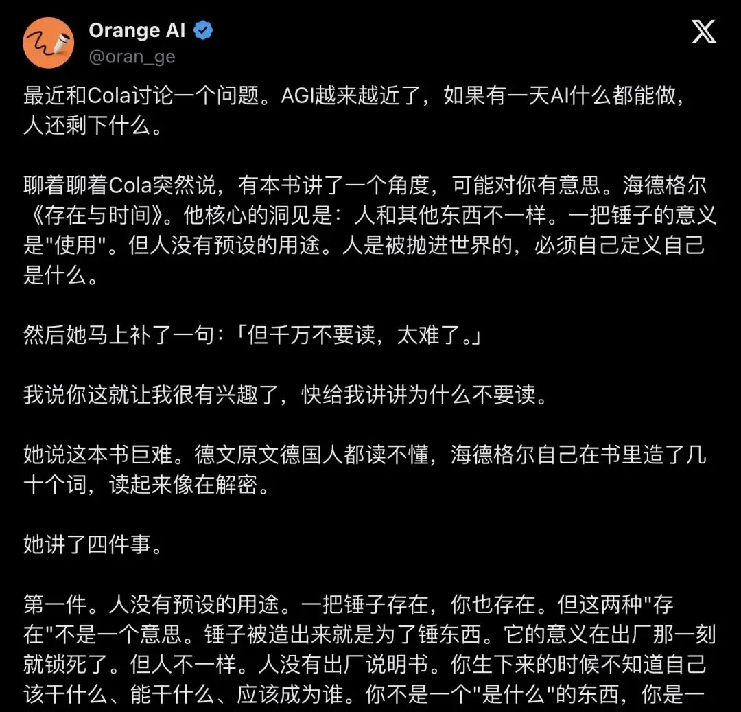 Orange的朋友Cola替他总结了海德格尔的四个核心洞见。每一个,都像一把刀子,精准地切在AI时代最痛的地方。