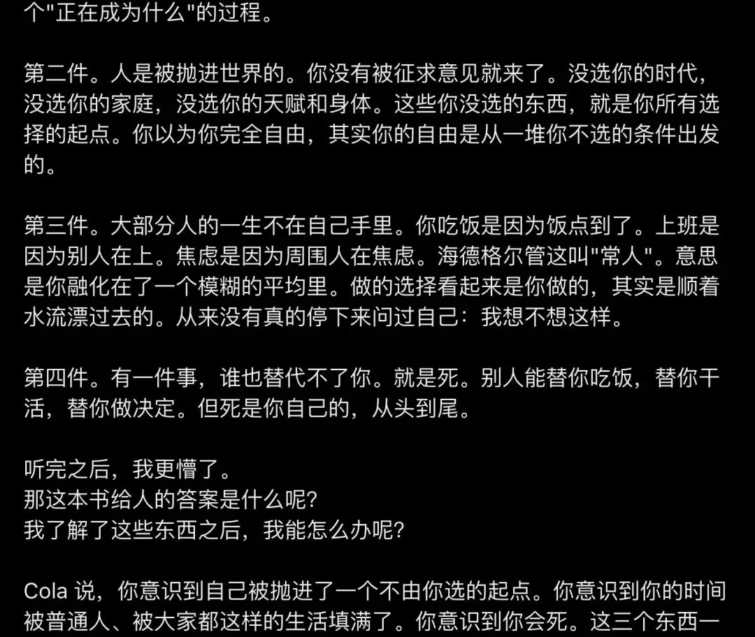 他引用Cola的总结说:当你意识到自己被抛进了一个不由你选的世界,当你意识到时间有限、没人能替你活,当你不得不面对这些事实——你会开始认真。