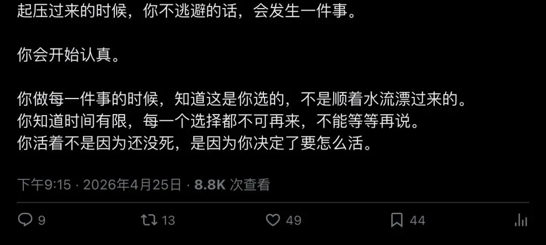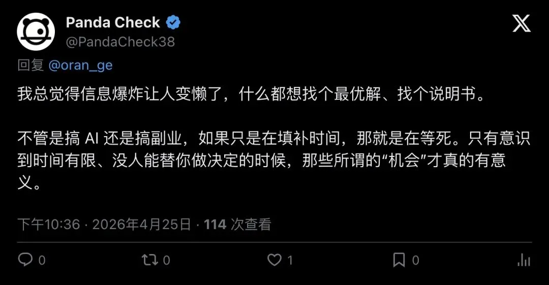 他还补了一句更狠的话:「不管是搞AI还是搞副业,如果只是在填补时间,那就是在等死。」