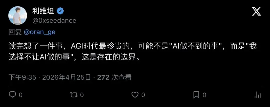 「AGI时代最珍贵的,可能不是’AI做不到的事’,而是’我选择不让AI做的事’。这是存在的边界。」