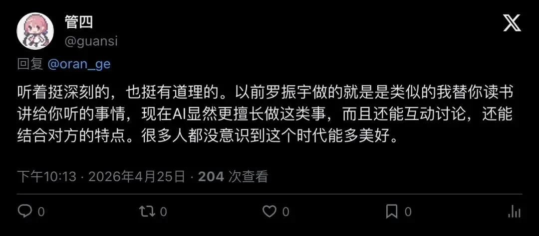 「以前罗振宇做的就是’替你读书讲给你听’,现在AI更擅长做这类事,还能互动、还能个性化。很多人都没意识到这个时代能多美好。」
