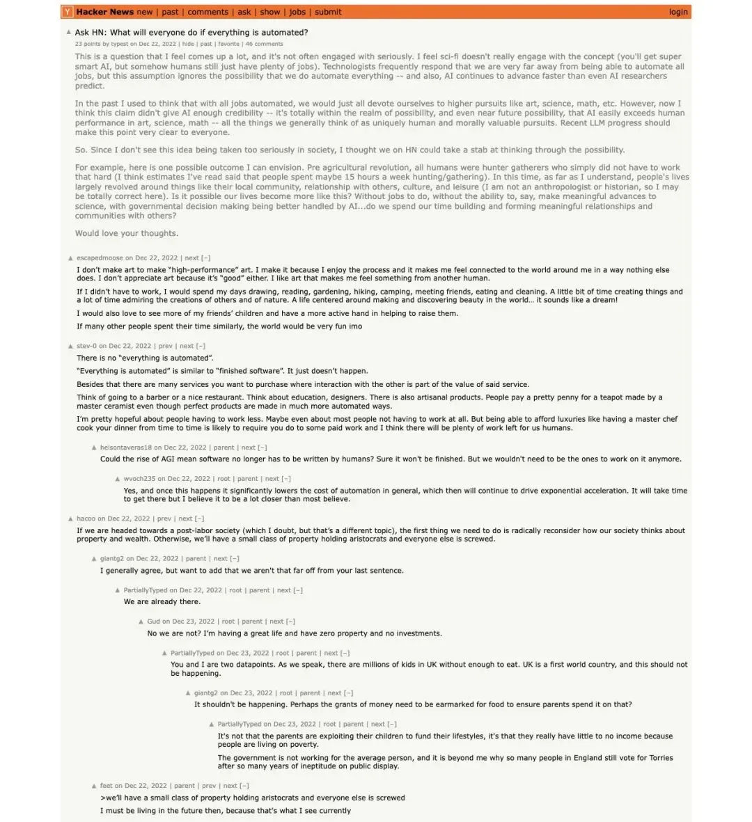 早在2022年,Hacker News上就有人发了一条帖子:「如果一切都自动化了,人类要做什么?」