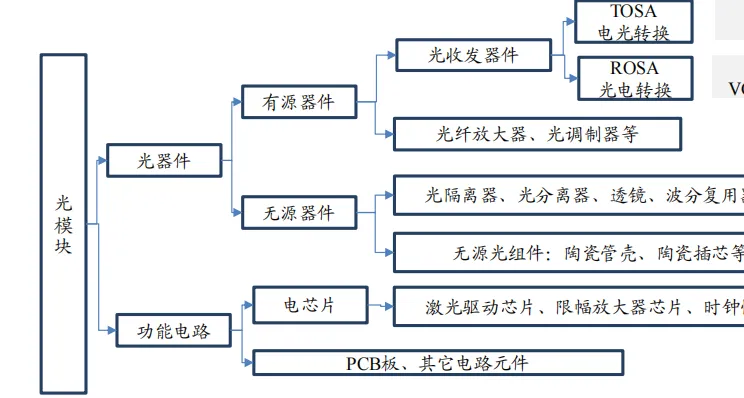 光模块主要由光发射器件(TOSA)、光接收器件(ROSA)、电芯片、PCB、结构件等组成,其中光发射器件及光接收器件等光器件为光模块核心部件,光器件的核心元件为光芯片。