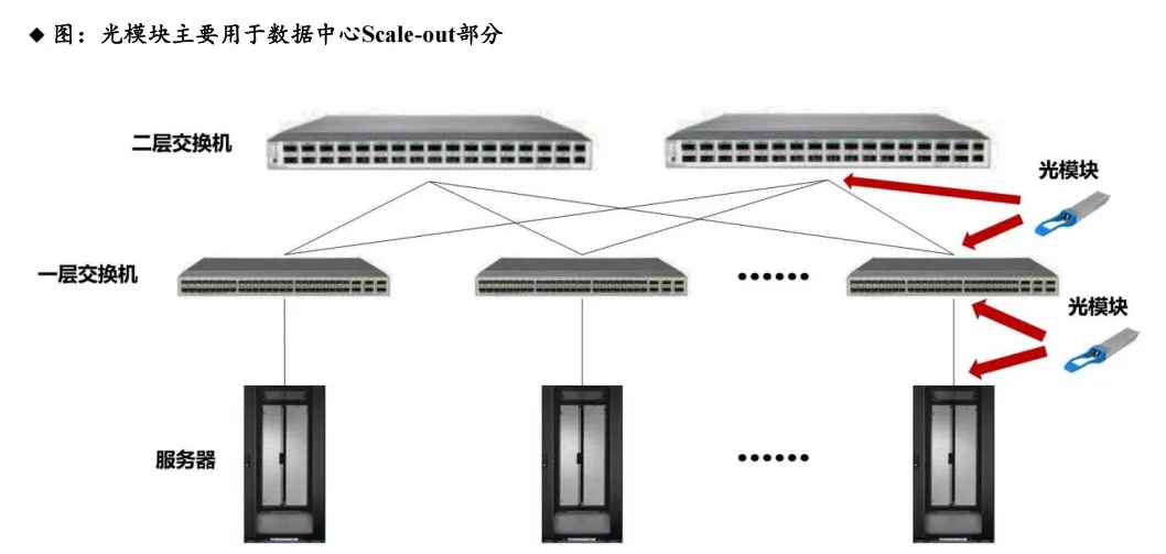 光模块的主要应用场景是数据中心横向扩展网络(Scale-Out,通常是指通过增加计算节点数量来提升整体计算 性能的跨机互联网络)部分。通常用于服务器连接到交换机以及交换机之间的互联。与之对应的,纵向扩展网络(Scale-Up,通常指节点内互联)主要采用PCB和铜连接来实现互联。