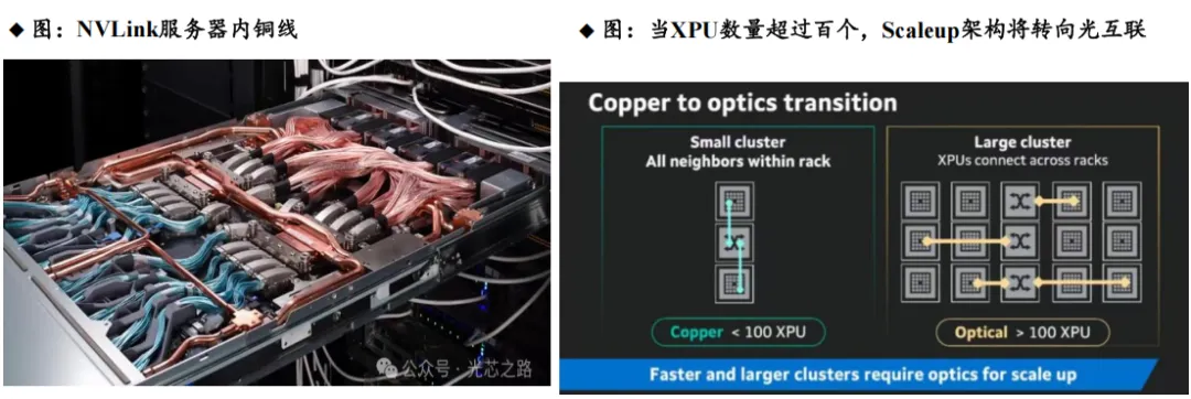 未来Scale-up新增高速率光模块需求,当前Scale-up主要采用PCB和铜连接来实现互联,未来无法满足大规模集 群需求。当前单个服务器内GPU、CPU、内存等组件连接在一起构成内部网络,Scale-up网络中不同芯片的连接采用PCIe、NVLink、UALink、CXL等协议;通过PCB上的铜线及PCB间的铜缆进行数据传输。但随着单服务器芯片数量增加,铜缆方案无法满足未来大规模集群的需求。