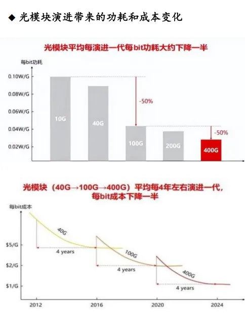 对低成本和高效率的追求是驱动模块迭代的核心因素,光电 I/O带宽每3-4年就会翻倍,成本和功耗效率遵循“摩尔定律”。 光模块平均每四年左右演进一代,每bit成本下降一半,每bit功耗下降一半,称为光电领域的“光摩尔定律”。