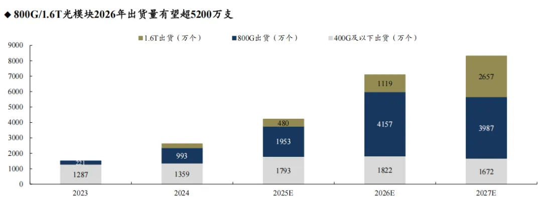 全球光模块2026年有望出货7000万支,800G以上有望超过5200万支。2026年全球800G以上光模块加速放量,2025年以来占比超过400G以下,2026年800G预计出货4100万支,1.6T出货1100万支。