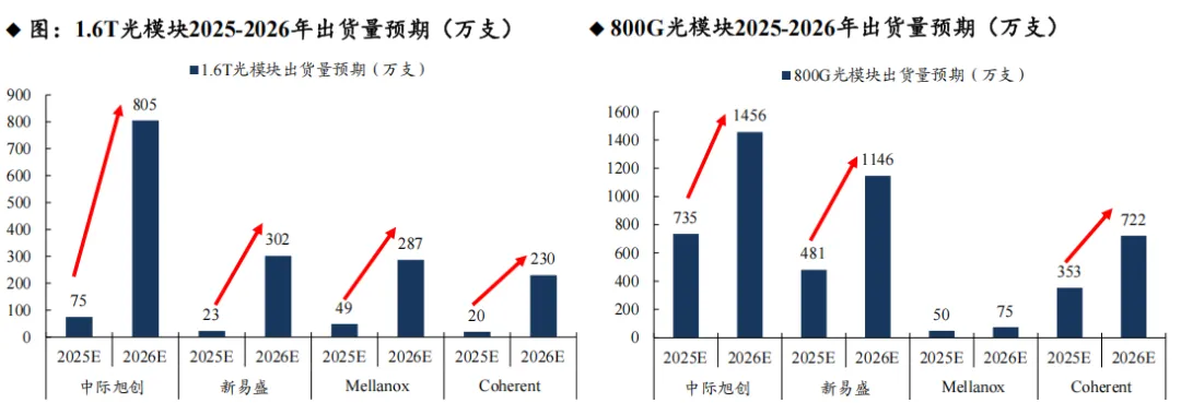 头部厂商2026年光模块出货迎来爆发式增长。1.6T光模块方面,预计2026年中际旭创/新易盛/Mellanox/Coherent出货量达805/302/287/230万支,相比2025年实现10倍增长;800G光模块方面,预计2026年中际旭创/新易盛/Mellanox/Coherent出货量达1456/1146/75/722万支,实现翻倍以上增长。2026年光模块的爆发式增长,对光模块企业的扩产能力提出了较大挑战。