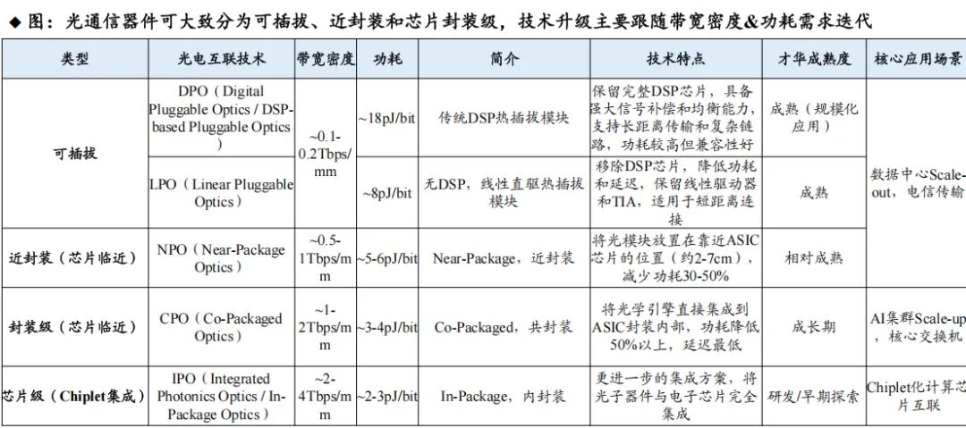目前受限于技术,成熟的方案仍是DPO可插拔式,NPO、CPO和IPO仍处于研发与成长期。随着各大厂商完成CPO、NPO研发,新一代高带宽、低功率光通信技术有望放量。