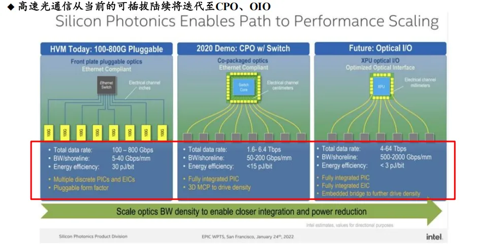 可插拔光模块是目前光通信的主流,随着带宽&功耗要求提高,先向CPO/OIO迭代。CPO与Optical I/O都是将光芯片和电芯片在基板上封装在一起的共封装技术,CPO将光电芯片和交换机芯片封装在同一个基板上面,不再需要射频走线和Redriver/Retimer等器件;终局OIO直接在基板上连接CPU,GPU,XPU,进一步缩短光通信与算力芯片的间距,达到更低功耗、更高带宽、更低延迟。