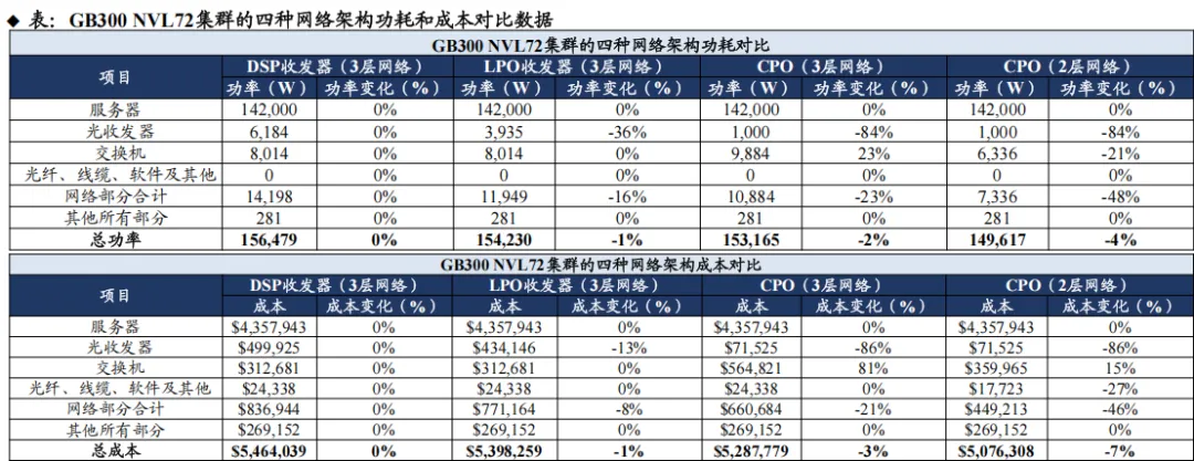 CPO可以显著降低光通信能耗,以基于三层网络的 GB300 NVL72 集群为例:①LPO:后端网络从 DSP 收发器切换到LPO 收发器,可以将总收发器功耗降低 36%,总网络功耗降低 16%。②CPO:完全过渡到 CPO 相比 DSP 光模块,节能效果更为显著——收发器功耗降低 84%——尽管部分节能效果会被交换机中新增的光引擎 (OE) 和外部光源 (ELS) 所抵消,这些组件的总功耗增加了 23%。