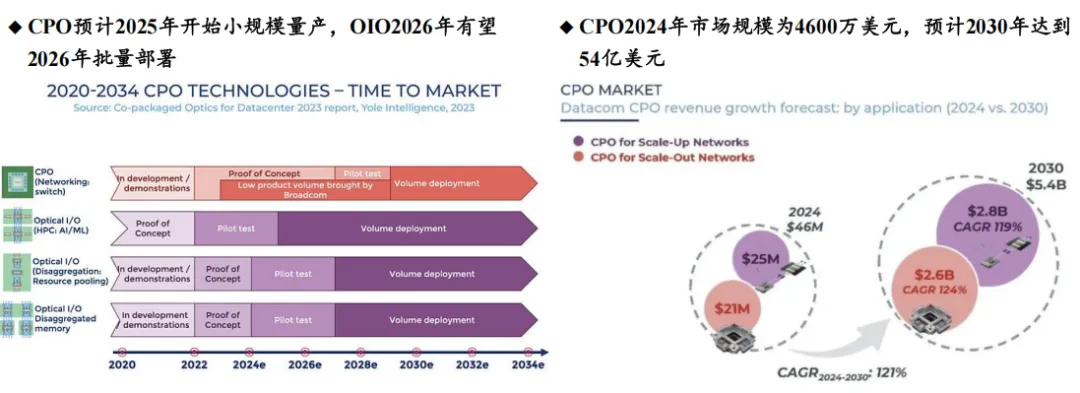 CPO预计2025年开始小规模量产,OIO2026年有望2026年批量部署。①CPO:2022年完成了概念验证,2023年以来仅博通完成了小批量部署,根据Yole Development预测,预计2028年后有望进行大规模部署。②算力OIO:2022年开始试验,根据Yole Development预测,2026年有望成为OIO元年。