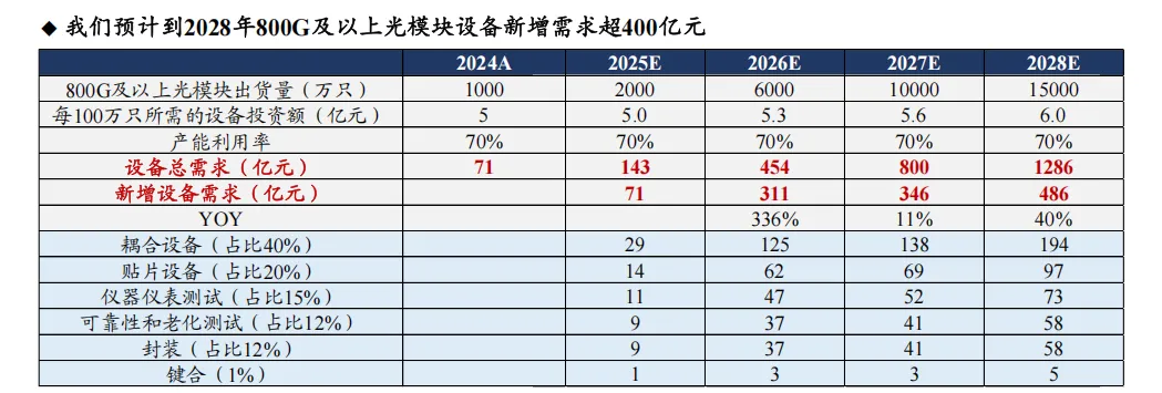 我们预计到2028年800G及以上光模块设备新增需求超400 亿元。其中耦合设备194亿元、贴片设备97亿元、仪器仪表测试73亿元、可靠性和老化测试58亿元、封装58亿元、键合5亿元。