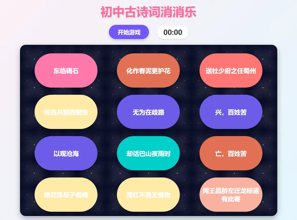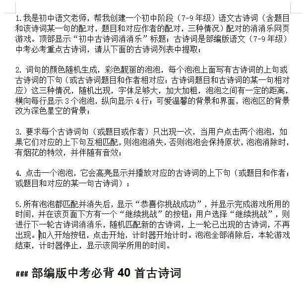 以“古诗词消消乐”为例,当时正值九年级一轮古诗词复习,普通班的孩子对枯燥的背诵兴致不高。我就想着用游戏来点燃他们的热情。前期需要先整理好初中阶段中考必考的古诗词,包括题目、作者和经典诗句。接着编辑指令,告诉AI我想要什么样的配对方式——可以是上下句配对,可以是题目和作者配对,也可以是题目和诗句配对。制作过程和随机点名差不多,核心就在于怎么向AI提问。指令越明确、越具体,AI执行得就越准确高效,做出来的东西也越合心意。当“古诗词消消乐”在屏幕上亮出来时,孩子们两眼放光,争先恐后地上台配对,连平时不爱举手的孩子都主动参与进来。一节课下来,诗词记住了,笑声也有了,复习效果出奇得好。