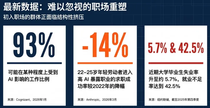 2026 年 1 月,Cognizant 估计,如今可能有 93% 的工作在某种程度上都会受到 AI 的影响。2026 年 3 月,Anthropic 报告指出,在 22–25 岁的年轻劳动者中,进入高 AI 暴露职业的求职成功率较 2022 年下降了 14%,这表明年轻、初入职场群体已经开始感受到更早的招聘压力。纽约联储也报告称,截至 2025 年第四季度,近期大学毕业生的失业率已上升到约 5.7%,而就业不足率则达到 42.5%,为 2020 年以来最高。