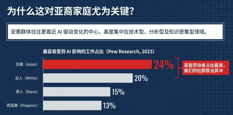 这对许多亚裔美国家庭尤其重要,因为他们往往更靠近 AI 驱动变化的中心,尤其集中在技术型、分析型以及其他知识密集型领域。Youth4AM 在 2023 年就提出过这个问题;当时 Pew Research 发现,在“最容易受到 AI 影响的工作”中,亚裔劳动者占比最高——亚裔为 24%,白人为 20%,黑人为 15%,西语裔为 13%。