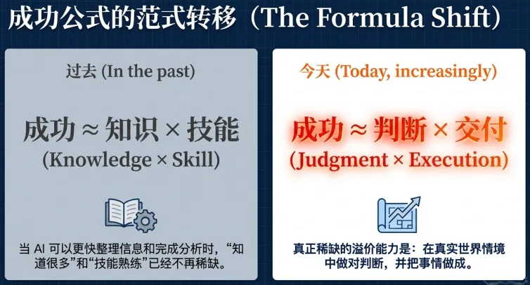 换句话说,当 AI 可以更快写代码、整理信息和完成分析时,“知道很多”和“技能熟练”已经不再稀缺。真正稀缺的能力是:做对判断,并把事情做成。