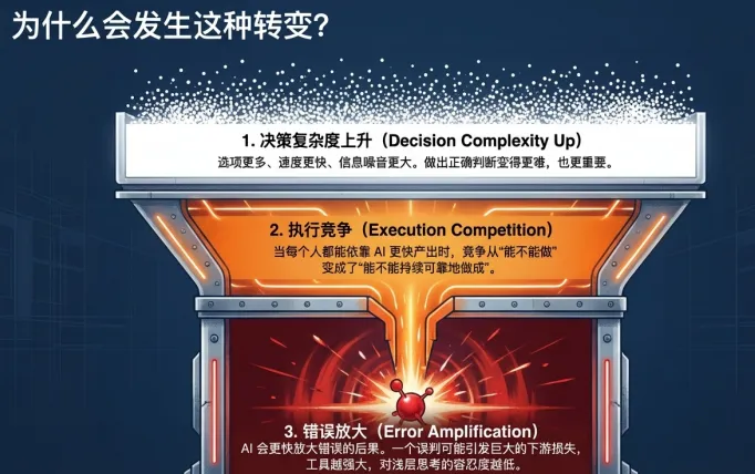 AI 也会更快放大错误的后果。一个误判可能迅速演变成错误的策略、错误的行动以及更大的下游损失。工具越强大,对浅层思考的容忍度就越低。