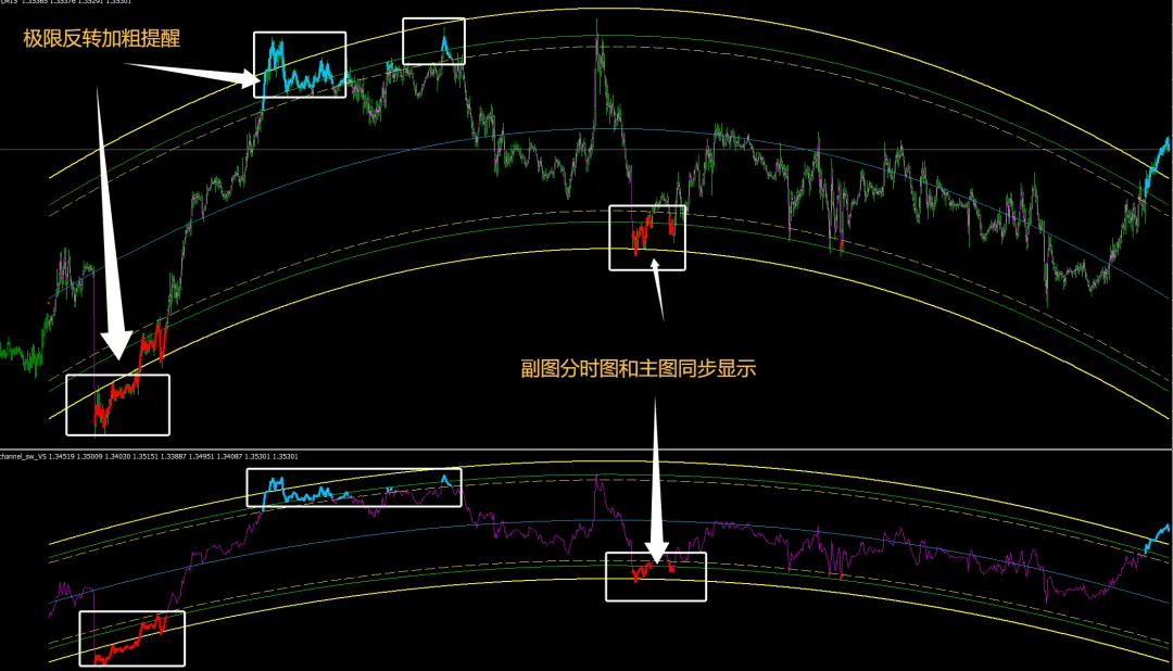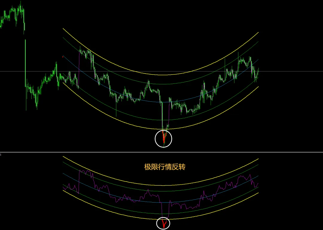 这是一种根据线性回归通道改编的应对极限行情组合策略,主图和副图同步显示,对于一些极端反转行情,起到预警和提示作用