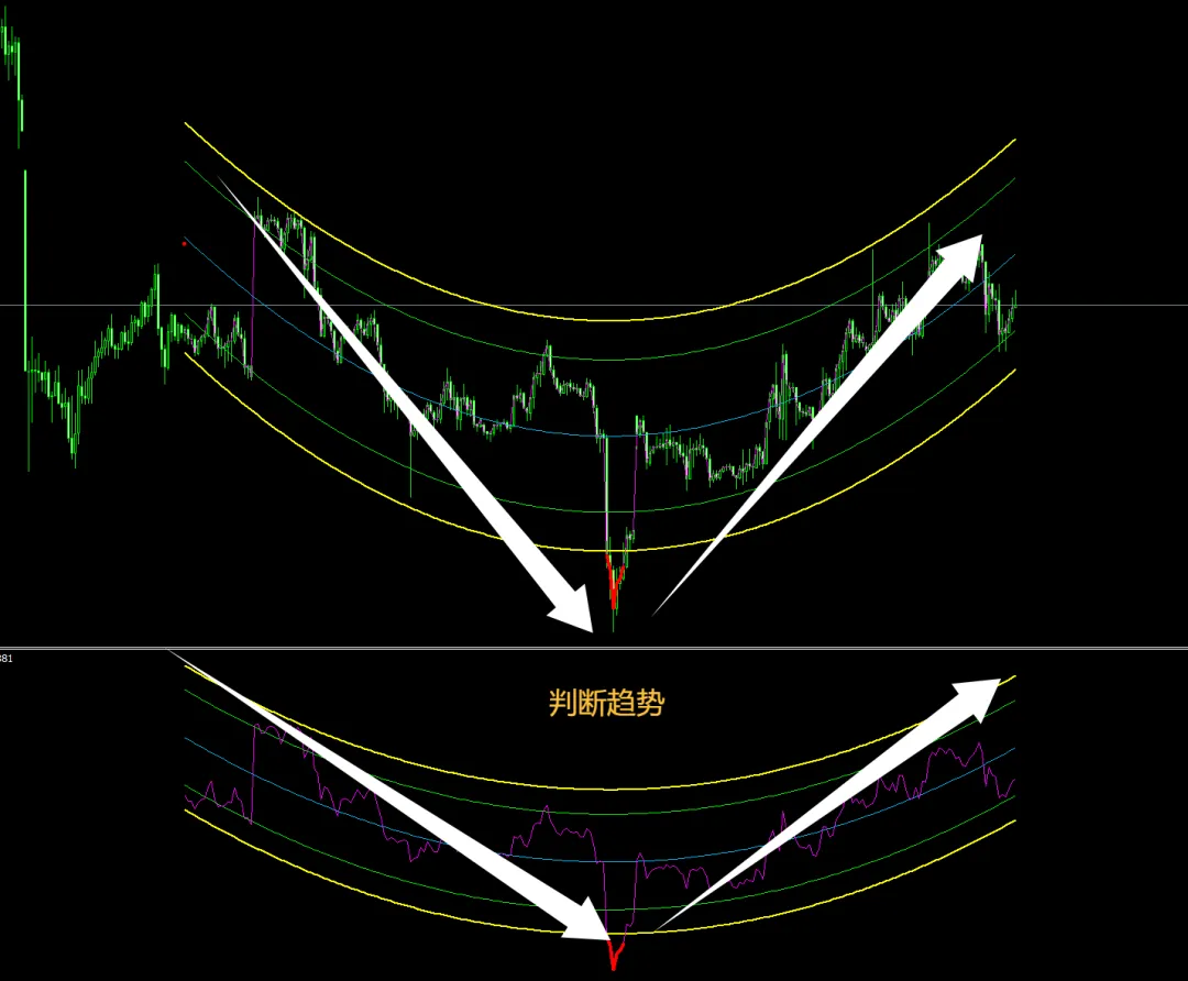 - 观察中线斜率:这是判断中期趋势最直接的方法。中线向上倾斜,表明市场处于上升趋势;向下倾斜,则处于下降趋势。