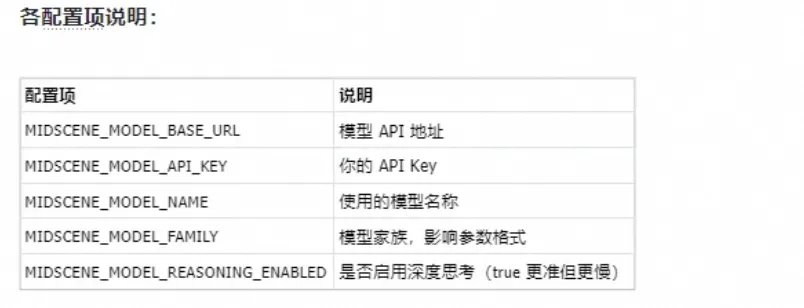 MIDscENE_MoDEL_BASE_uRL-"https://open-bigmodel-cn/api/paas/v4"MIDSCENE_MODEL_API_KEY="你智谱API Key"MIDSCENE_MODEL_NAME-"gLm-4.6V"MIDSCENE_MODEL_FAMILY="gLm-y"MIDSCENE_MODEL_REASONING_ENABLED-"false"