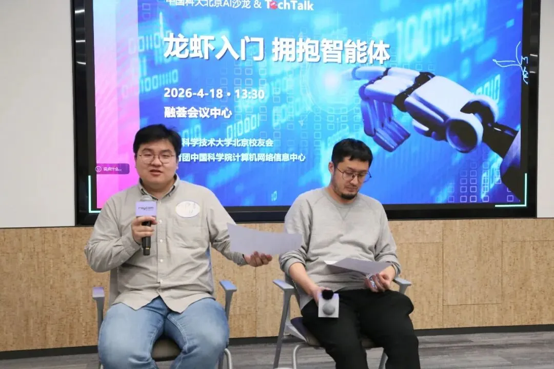 4月18日,中国科大北京校友AI沙龙之《龙虾入门 拥抱智能体》专题在融科资讯中心举行。中国科大、中科院计算机网络信息中心、中科院计算所校友师生约100人出席;还有120余位校友和中国科大在校生线上参会。