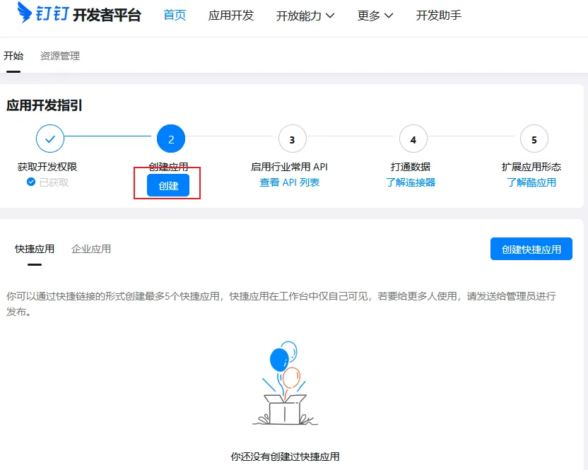 Step1:浏览器访问网址https://open.dingtalk.com/,打开”钉钉开放平台”的官网,进入到开发者后台,点击”创建”按钮开始创建应用。
