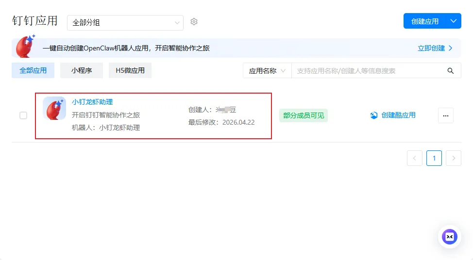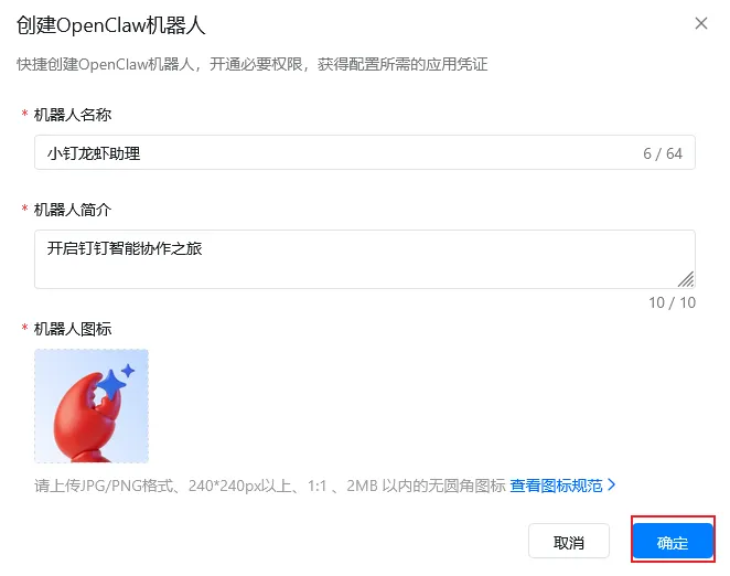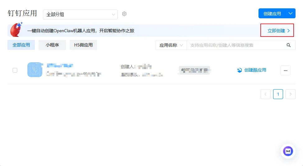 Step2:在创建应用的界面中,平台已经提供了快速创建OpenClaw机器人应用的通道,我直接点击”立即创建>”按钮,输入机器人的名称和简介,点击”确定”按钮后即可完成应用的创建。