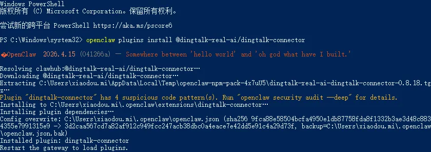 Step1:接下来我需要安装飞书接入OpenClaw的插件,打开命令行(CLI)工具,输入安装官方插件的命令”openclaw plugins install @dingtalk-real-ai/dingtalk-connector”,按回车后自动安装钉钉插件。