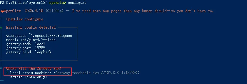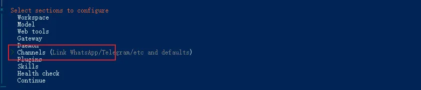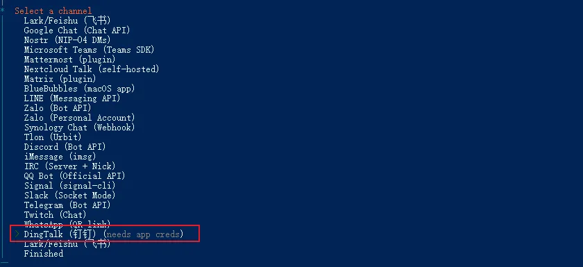 Step2:在完成钉钉插件安装后,我输入命令”openclaw configure”进行交互式配置,选择增加消息通道选项,并选择”钉钉”通道选项。