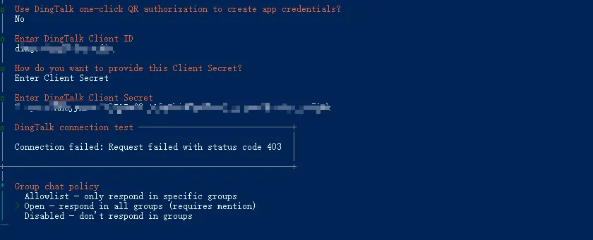 Step3:接着按要求我输入钉钉应用中生成的Client ID和Client Secret凭证,完成钉钉通道的接入配置。