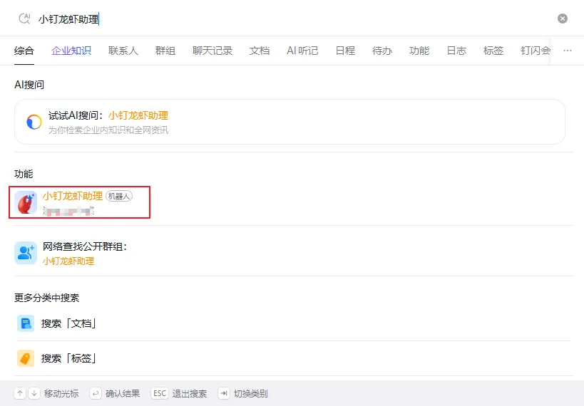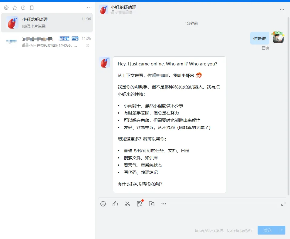 Step1:接下来我需要验证是不是配置成功了,我在钉钉主界面中搜索我创建的机器人助理,点击它打开聊天界面,我给它发个消息,看到有消息回复表明我的OpenClaw龙虾已经正常接入到钉钉中了。