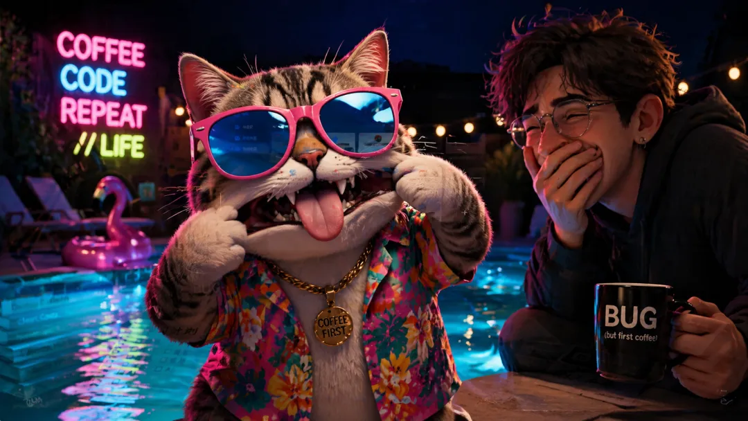 有一次,他想让AI生成一段“一只咖啡猫在泳池前面跳舞逗美女笑”的视频,要滑稽的感觉。结果AI给他生成了一个画面:猫面无表情地站着,美女也面无表情,整个场景像两个木头人在发呆。
