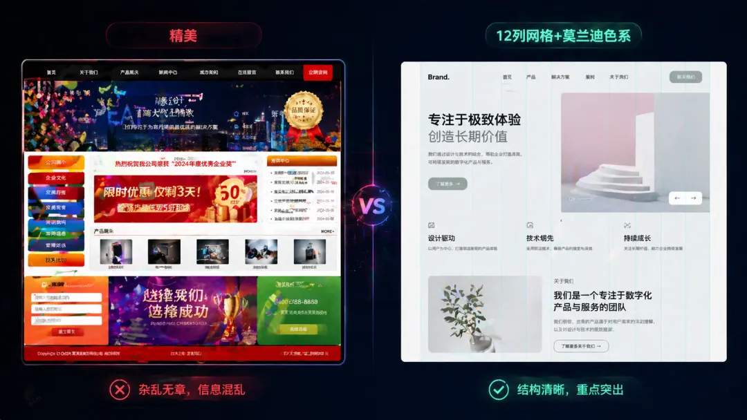 但后来我试了一下——把这段话原封不动喂给AI。结果它生成的页面,确实比我说“精美”时好了一百倍。