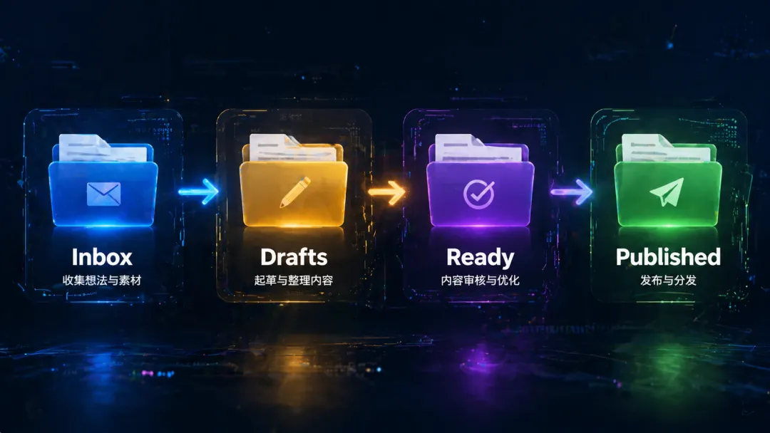 设置严格的目录结构:Inbox(素材库)、Drafts(草稿箱)、Ready(待发布)、Published(已归档)。