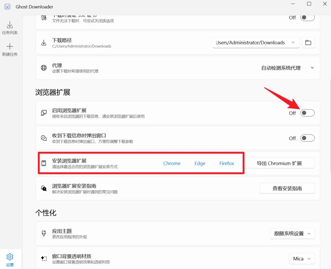 另外,Ghost Downloader还支持接管浏览器的下载任务,兼容Chrome、Edge、Firefox这几款主流浏览器,安装后启用对应的浏览器扩展程序,就能替代浏览器自带的下载功能。