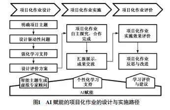 AI赋能的项目化作业流程始于“项目化作业设计”阶段, 在此, AI通过智能主题生成与虚拟专家顾问两大功能, 深度介入明确项目主题、 设计驱动性问题等关键环节, 为项目提供前沿的选题与专业的理论支撑。进入项目化作业实施阶段, 学生在AI的个性化学习支持下进行自主探究与合作学习, 最终完成汇报展示与成果交流。最后, 在项目化作业评价阶段, 教师不仅对学生项目化作业的实施效果进行评价, 更注重引导反思与改进, 并借助AI能力提供个性化的学习评价与建议, 从而形成一个融合智能设计、 动态支持与精准评估的完整教学循环, 显著提升了项目化学习的科学性、 可行性与有效性, 如图1所示。