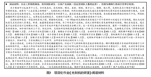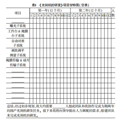 图3项目化作业《光刻机的研发》阅读材料教师结合光刻机的科普资料、 技术简介、 相关专利, 以及人工智能虚拟专家咨询的相关内容, 设计了如表1所示的项目甘特图(空表), 为了解决驱动性问题, 学生需要从光刻机系统的整体出发, 考虑系统中不同子系统的研发周期, 逐步完成项目开发流程的规划, 因此学生需结合自身资料查询的结果, 以及项目化作业的条件限定, 计算出研发团队的时间和成员要求, 完成项目甘特图, 进而解决光刻机研发初期的规划问题。