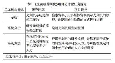 鉴于光刻机的研发属于非常复杂的工程任务, 因此教师有必要将整个项目化作业进行任务拆分, 如表2所示, 学生可以分步骤来完成任务, 解决不同的研究问题, 围绕核心问题层层推进, 从而在项目化作业完成的同时对整个项目有全面的认知, 促进整个单元的素养落实。