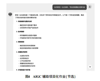 在“光刻机的研发”这一项目化作业中, 即使教师将总任务分为了不同的子任务, 但由于光刻机的研发资料保密程度较高, 学生信息检索能力有限时, 极有可能找不到或者找到很少与光刻机研发相关的资料。在这种情况下, 生成式人工智能技术可以成为学生获取信息和资源的有力辅助工具, 它能够基于现有的知识和数据生成新的内容, 帮助学生填补信息检索中的空白。例如, 提供模拟的光刻机研发案例、 技术参数和设计思路等, 这些虽然不是真实的研发资料, 但可以作为教学和学习的参考, 如图4所示。当然学生也应当将生成的内容与专业的资料文档进行相互的佐证, 必要时教师和学生应当咨询专业人士, 从而避免科学性的错误。