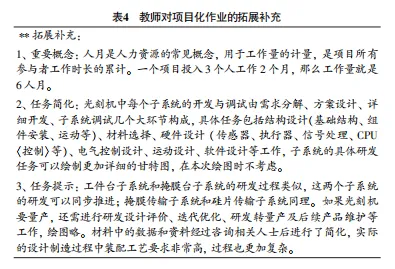 在实际使用过程中, 项目化作业的效果会因为学生对任务难度、 清晰度、 兴趣程度不尽相同[7], 因此教师有必要根据学生的实际作答情况, 考查学生的已有真实认知水平, 对项目化作业进行优化。复杂工程任务涉及较多真实情境中的人、 事、 物, 学生缺乏工程实践经验, 教师有必要对真实的工程项目研发进行补充, 如表4所示, 在保证科学性、 真实性的前提下, 拓展补充工作量如何计量表示、 任务的简化思路、 任务提示, 帮助学生更好地完成光刻机研发的项目甘特图。